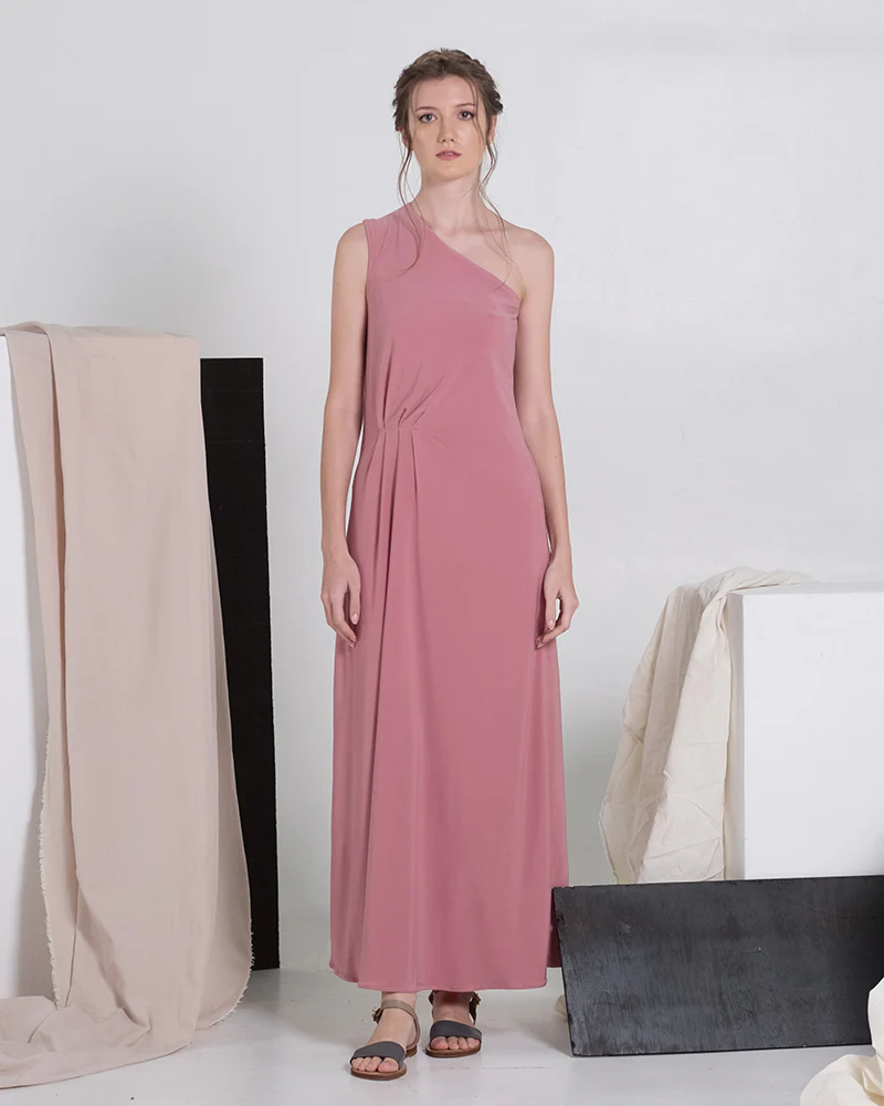 One shoulder maxi dress. Wear with flats for a casual day and dress up with heels for formal events