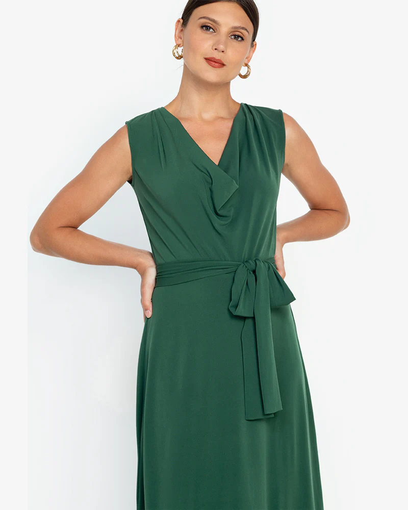 Made of jersey. Gaetana midi dress features a flattering drape over the neckline and a self tie belt that cinch the waist. Perfect to pair with any type of sandals.