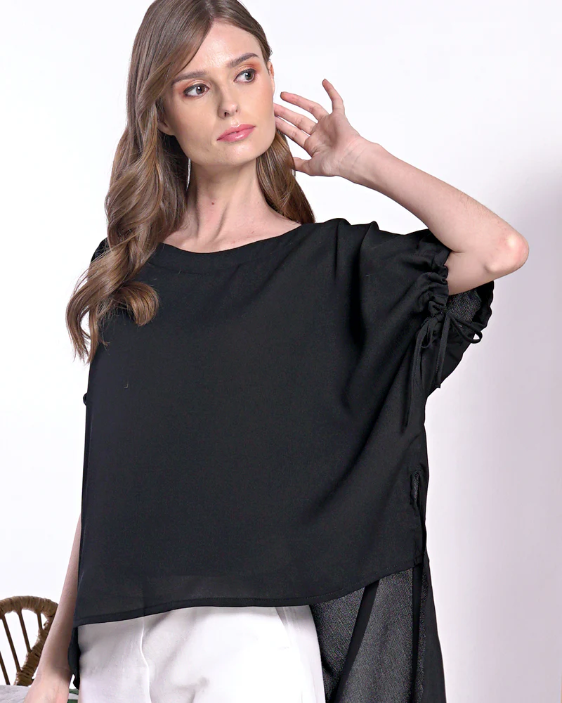 Made of crepe. Gian top is a relaxed piece as it looks which makes it wearable even in the beach. Garter emphasized the sleeves. Wear it as a cover up piece or dress down with a pair of linen pants.