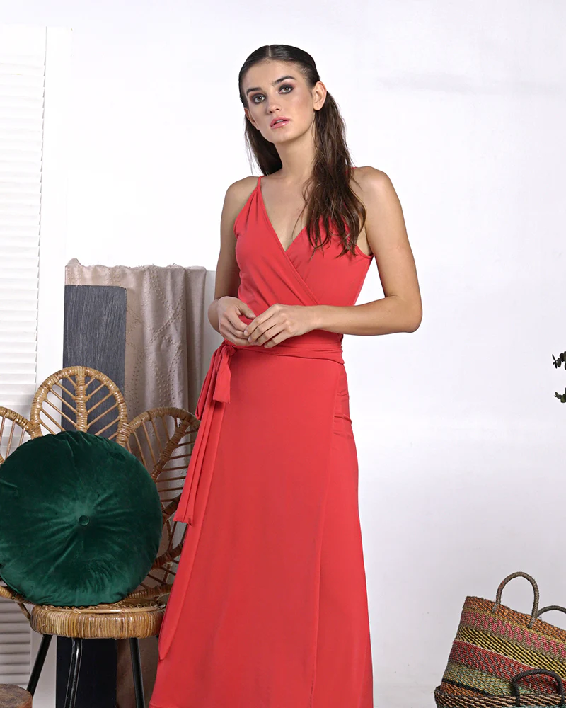 Made of jersey. Iesha midi dress has a wrap silhouette with a low-cut back and tie waist. Designed for a slim fit. It's the perfect year-round piece.