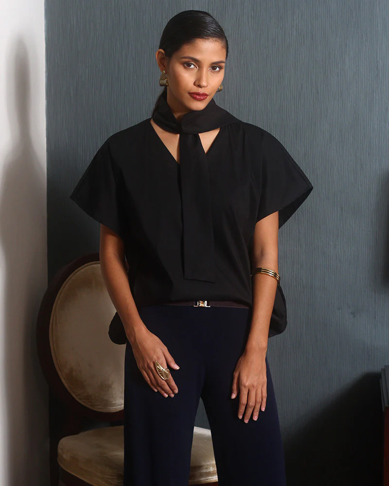 The Maxene has an attached neckpiece that can be tied as a ribbon or left as is. The perfect accent to exude sophistication and style.