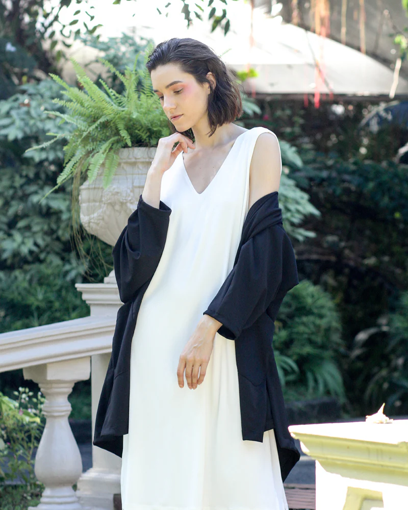 A long sleeveless maxi dress with two overlapping fabrics. Exudes grace and elegance.