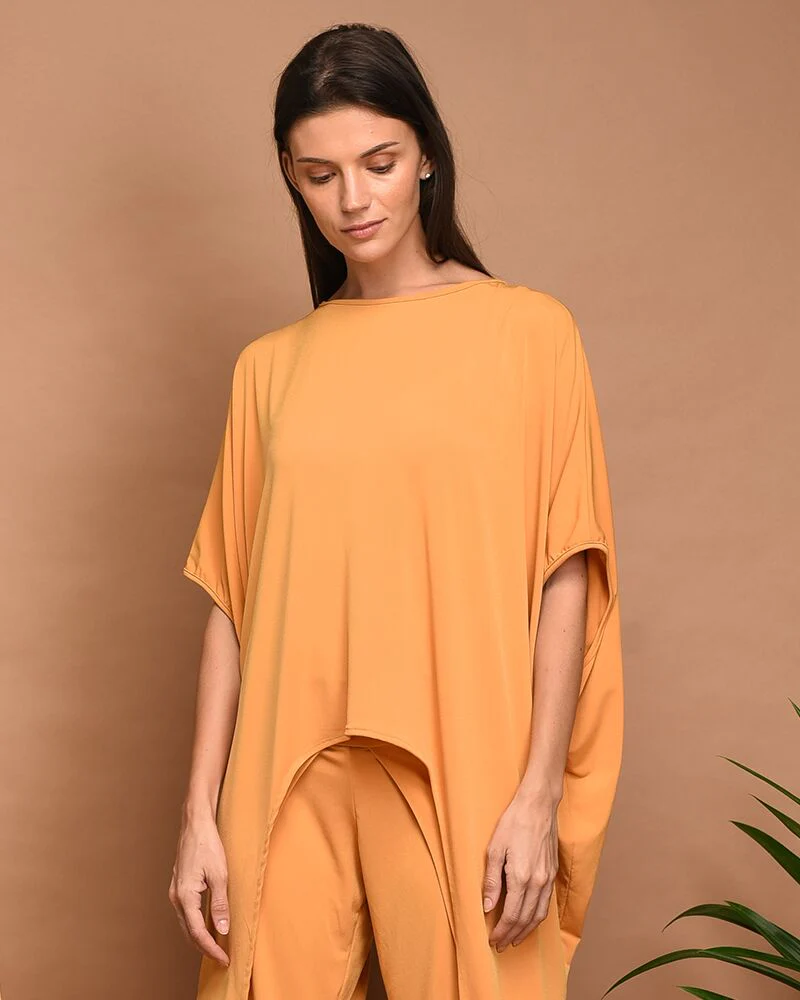 This reversible top can be cinched to show the belly on one side. But on the other side, the uneven top can be left as is to be paired with loose pants,