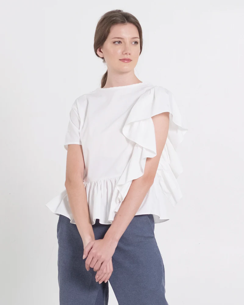 Made of cotton stretch. Rialta top features a ruffled sleeves that drapes beautifully along the body. Peplum peating along the hem makes it looks more modern and chic.
